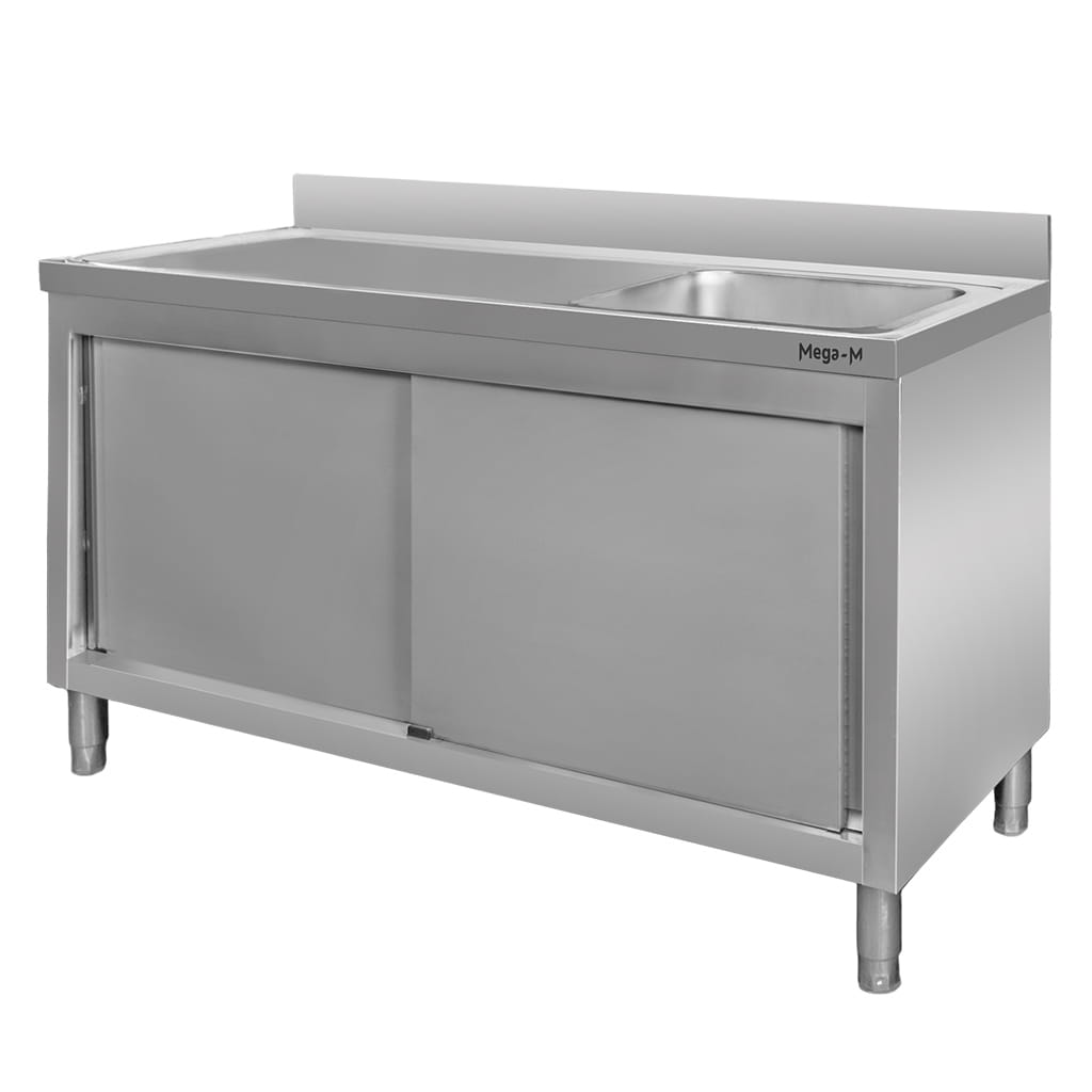 Doskonale sprawdzi się w różnego rodzaju lokalach gastronomicznych – od restauracji, barów i hoteli, po stołówki, zakłady produkcji spożywczej po placówki edukacyjne, takie jak żłobki, przedszkola i szkoły. Przemyślany układ mebla sprzyja wygodnej organizacji pracy – blat po lewej stronie zapewnia przestrzeń do przygotowywania potraw, natomiast komora po prawej stronie umożliwia sprawne mycie i płukanie używanych akcesoriów. Rant zabezpiecza ścianę przed zachlapaniem, a zamykana szafka umożliwia uporządkowane i higieniczne przechowywanie np. środków czystości.