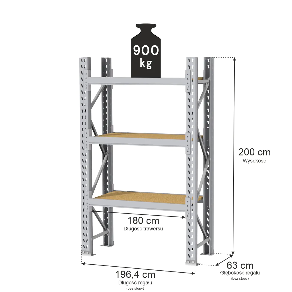 - Maksymalna nośność na półkę: 900 kg przy równomiernie rozłożonym obciążeniu