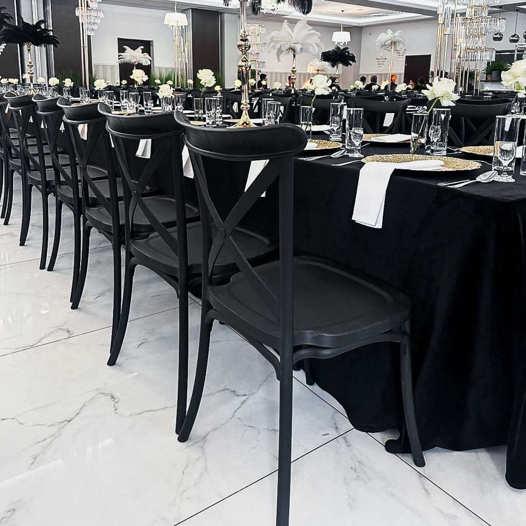 Doskonale sprawdzą się w restauracjach, hotelach, salach weselnych w stylu industrialnym, kawiarniach oraz podczas eventów firmowych i przyjęć plenerowych. Ich uniwersalny czarny kolor oraz charakterystyczne oparcie pozwalają stworzyć nowoczesną, elegancką aranżację wnętrza. Dzięki odporności na wilgoć i promieniowanie UV możesz wykorzystywać je również w ogródkach restauracyjnych i namiotach eventowych.