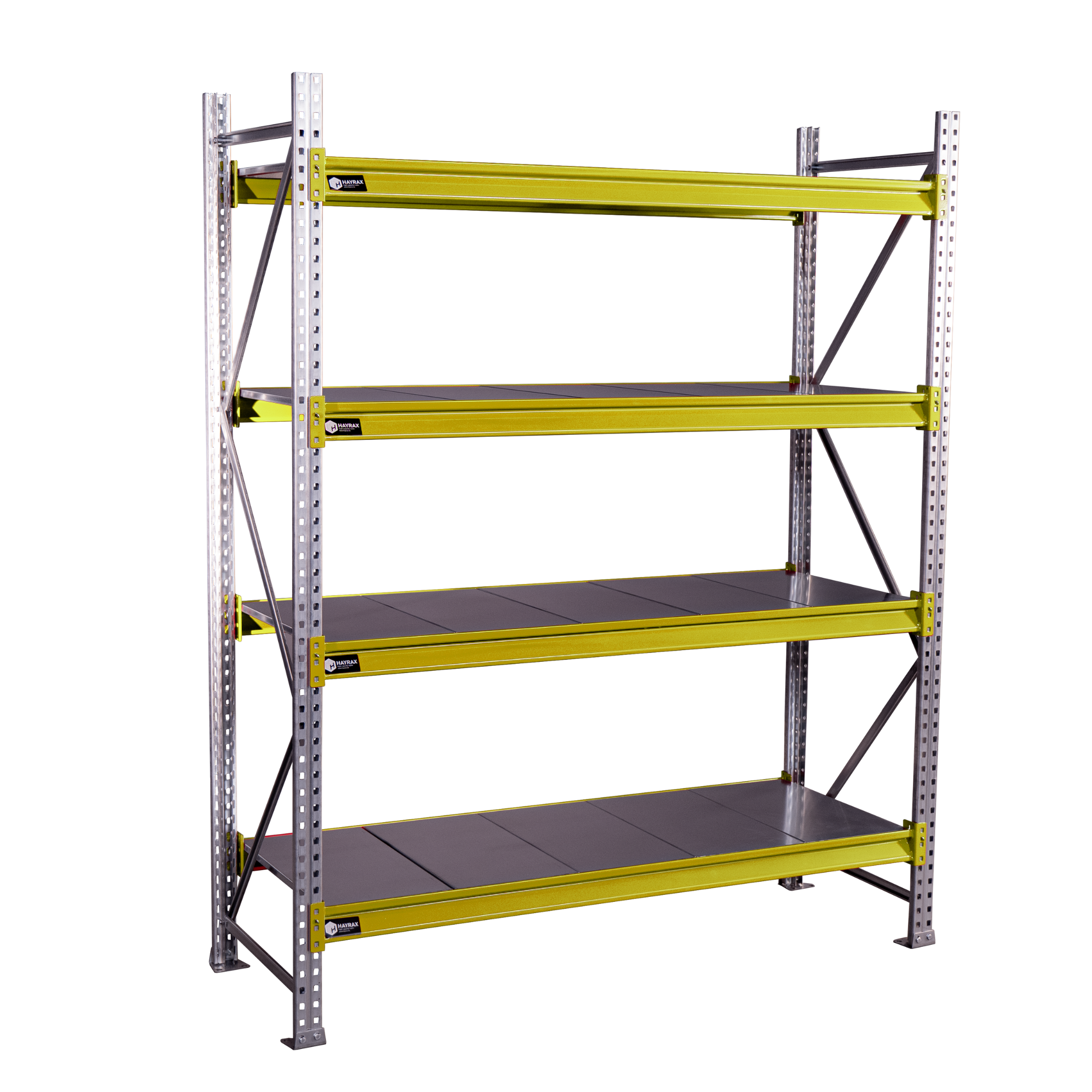 Każda półka oparta jest na dwóch belkach nośnych z zabezpieczeniami przeciw wypięciu. Wypełnienie stanowią metalowe panele o szerokości 30 cm, dopasowane do głębokości regału.