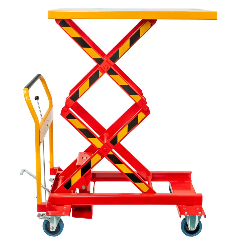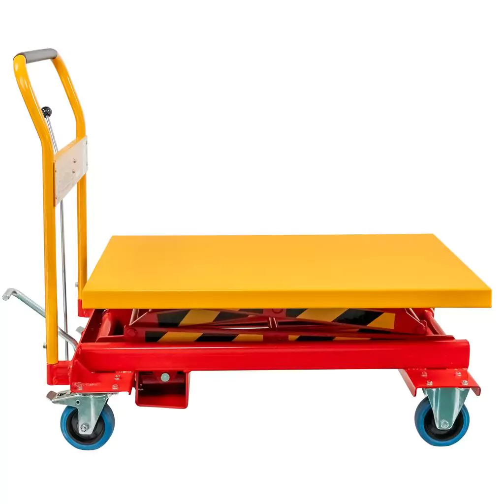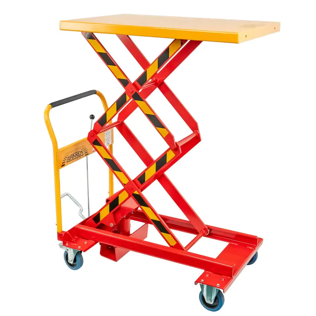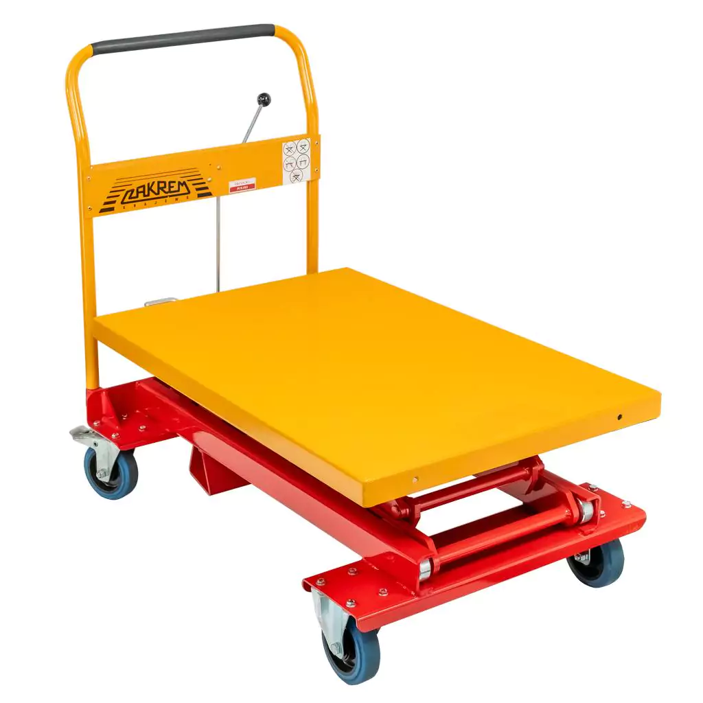 Wózek podnośnikowy stołowy polskiej marki ZAKREM o udźwigu do 300 kg służy do przewożenia materiałów i towarów w magazynach i halach. Blat o powierzchni 91x60 cm zapewnia dużą przestrzeń do przewożenia towarów. Platforma unosi się na wysokość w zakresie od 39,5 do 128 cm. Pozwala to na dopasowanie wysokości wózka do indywidualnych preferencji. Wózek został wykonany ze stali odpornej na uszkodzenia mechaniczne, co gwarantuje stabilność oraz długotrwałe użytkowanie. Prosta w obsłudze hydrauliczna pompa nożna umożliwia płynne i precyzyjne podnoszenie blatu roboczego. Koła z hamulcem pozwalają na bezpieczne i szybkie przemieszczanie urządzenia nawet po nierównej powierzchni. Dzięki bezstopniowej regulacji prędkości opuszczania praca z wózkiem jest płynna i szybka.