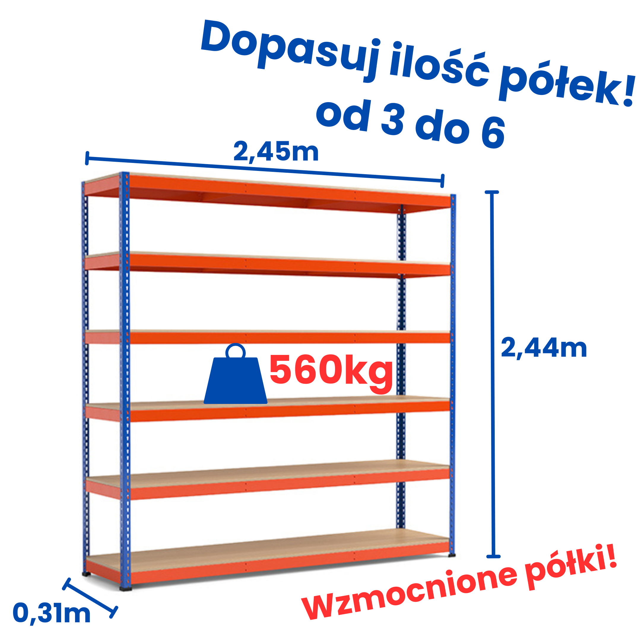 Regał Magazynowy 2,44 (h) x 2,45 x 0,32 mm z Półkami Wiórowymi 16mm dodatkowo wzmocnionymi!