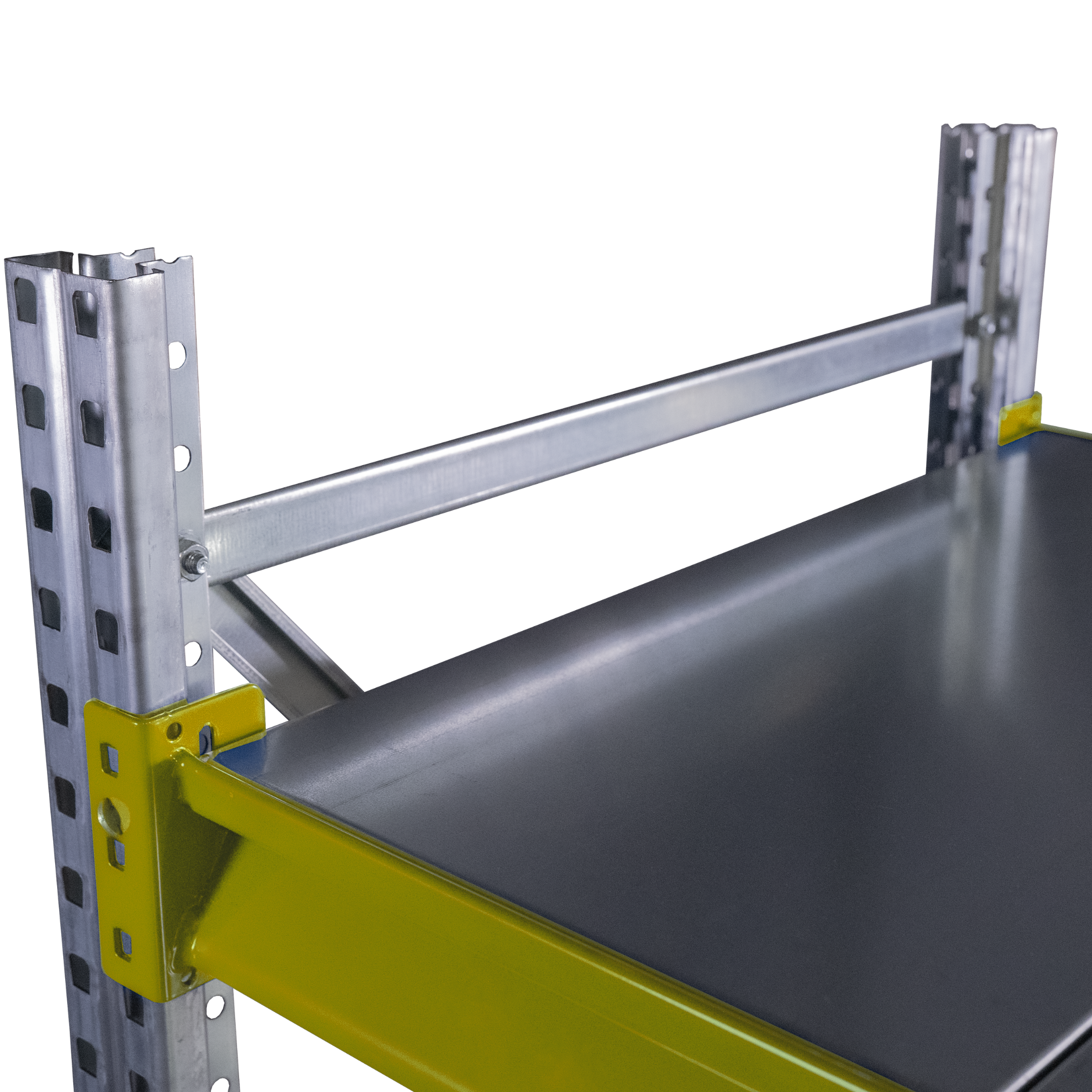 Każda półka oparta jest na dwóch belkach nośnych z zabezpieczeniami przeciw wypięciu. Wypełnienie stanowią metalowe panele o szerokości 30 cm, dopasowane do głębokości regału.