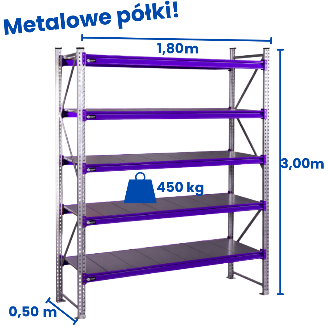 Regał magzynowy Hayrax FleXo 300x180x50cm,450kg nośności, 5 półek, moduł bazowy