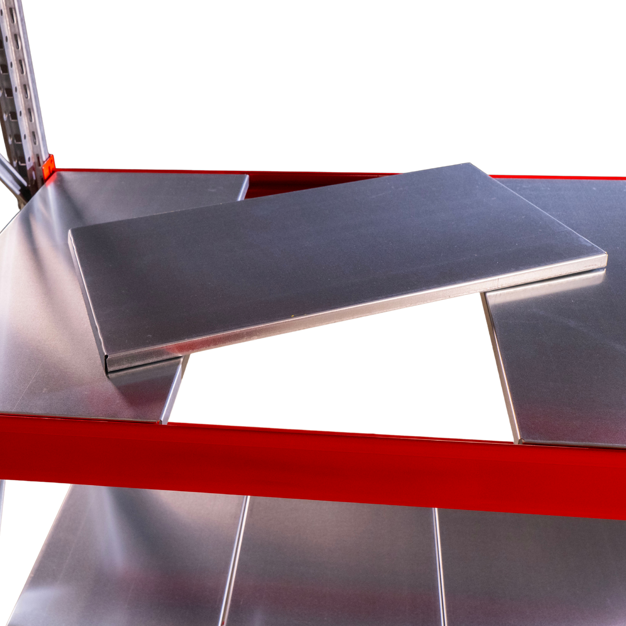Każda półka oparta jest na dwóch belkach nośnych z zabezpieczeniami przeciw wypięciu. Wypełnienie stanowią metalowe panele o szerokości 30 cm, dopasowane do głębokości regału.