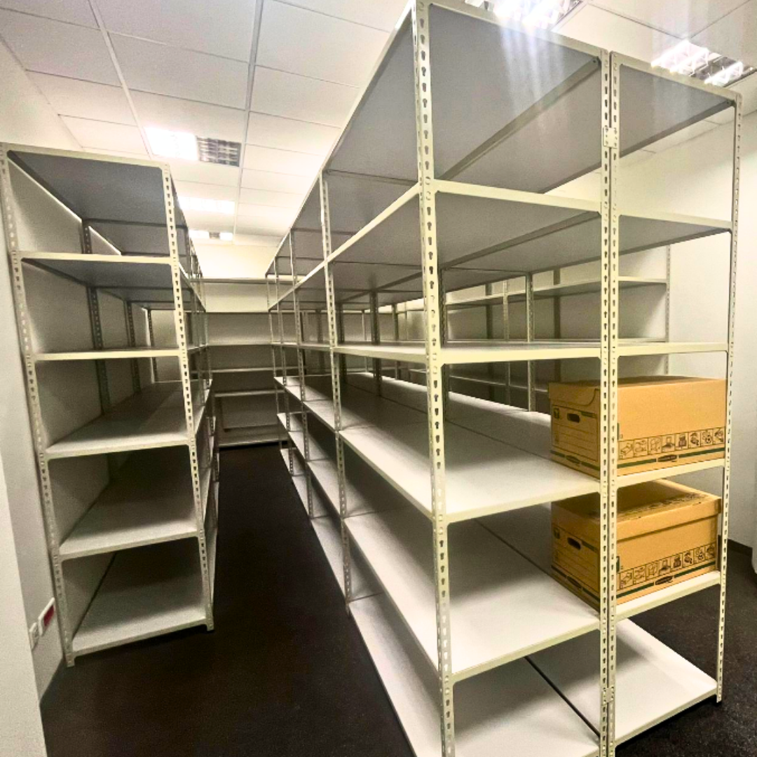 - Modułowość – możliwość łączenia regałów złączkami w ciągi oraz dokładania kolejnych półek.