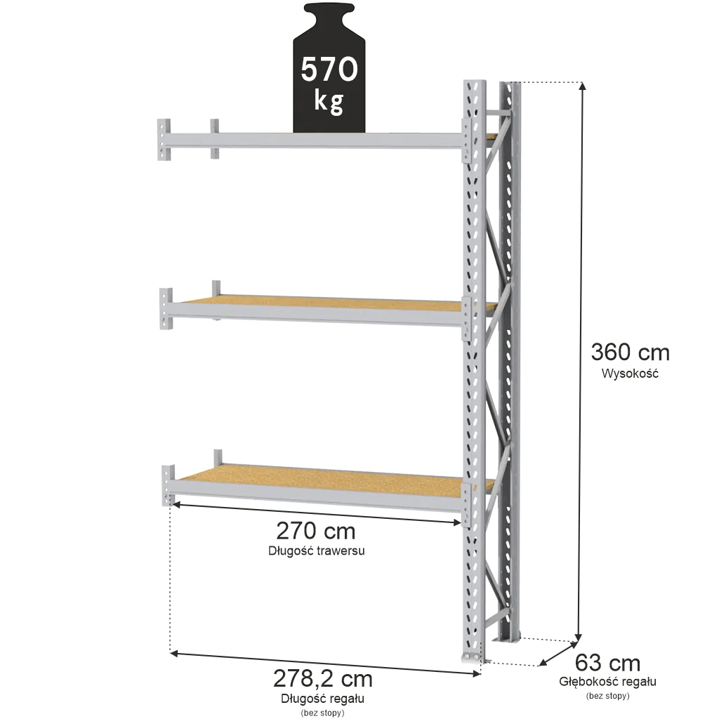 Regał magazynowy 3-półkowy MAGO HX H-360 cm G-63 cm L-278,2 cm moduł dostawny 570 kg