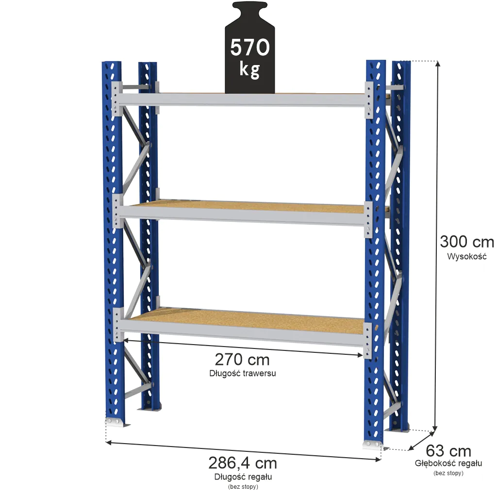Regał magazynowy 3-półkowy MAGO HX H-300 cm G-63 cm L-286.4 cm moduł bazowy 570 kg