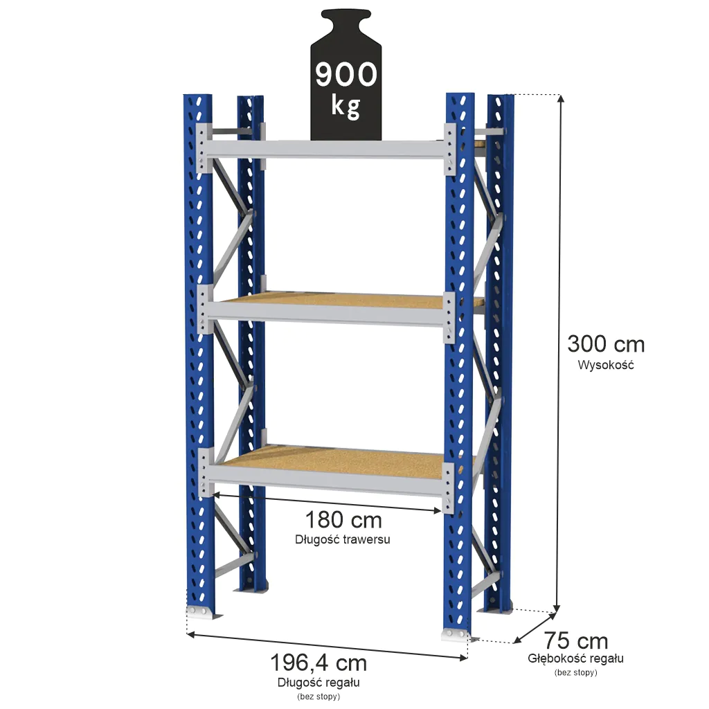 Regał magazynowy 3-półkowy MAGO HX H-300 cm G-75 cm L-196.4 cm moduł bazowy 900 kg