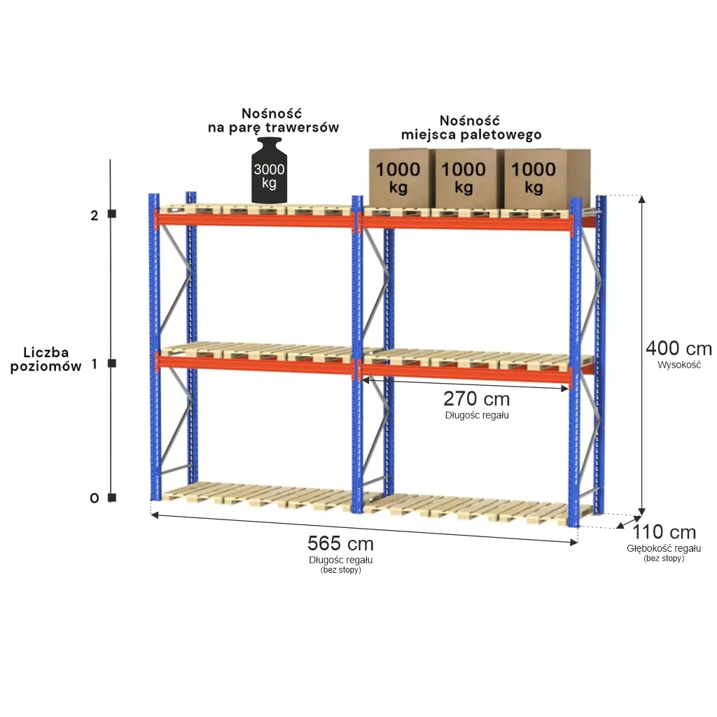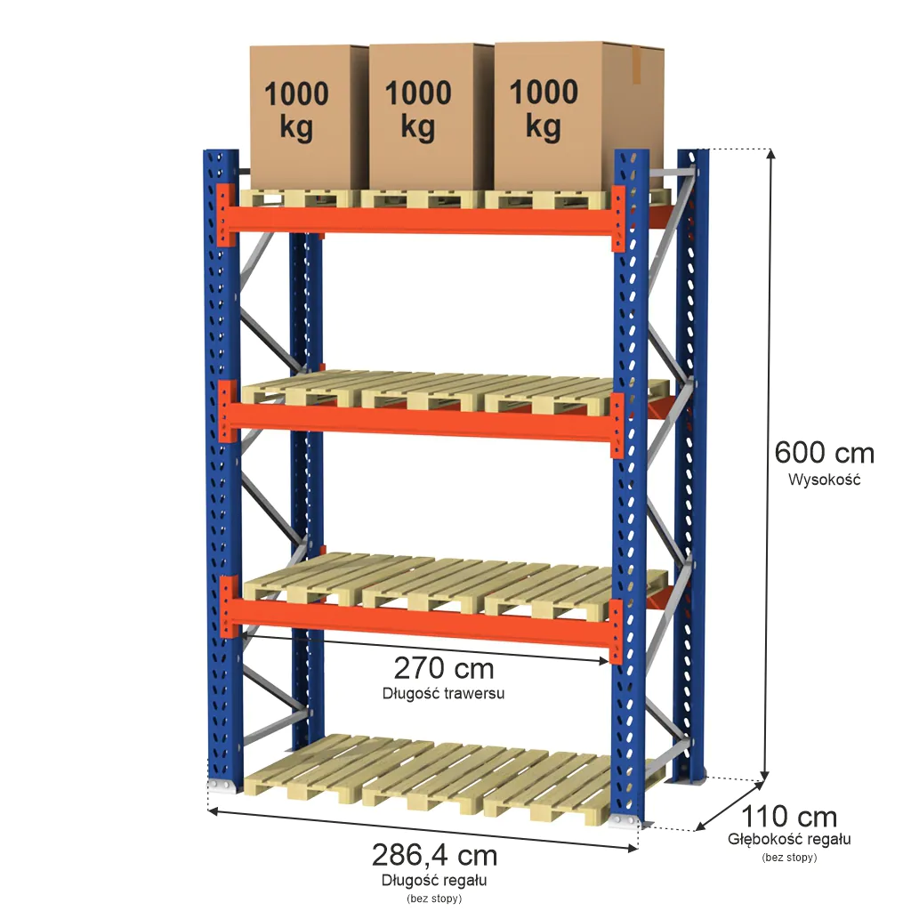 Regał magazynowy paletowy MAGO HX 0+3 H-600 cm L-286,4 cm moduł bazowy, 3000 kg nośność na parę trawersów