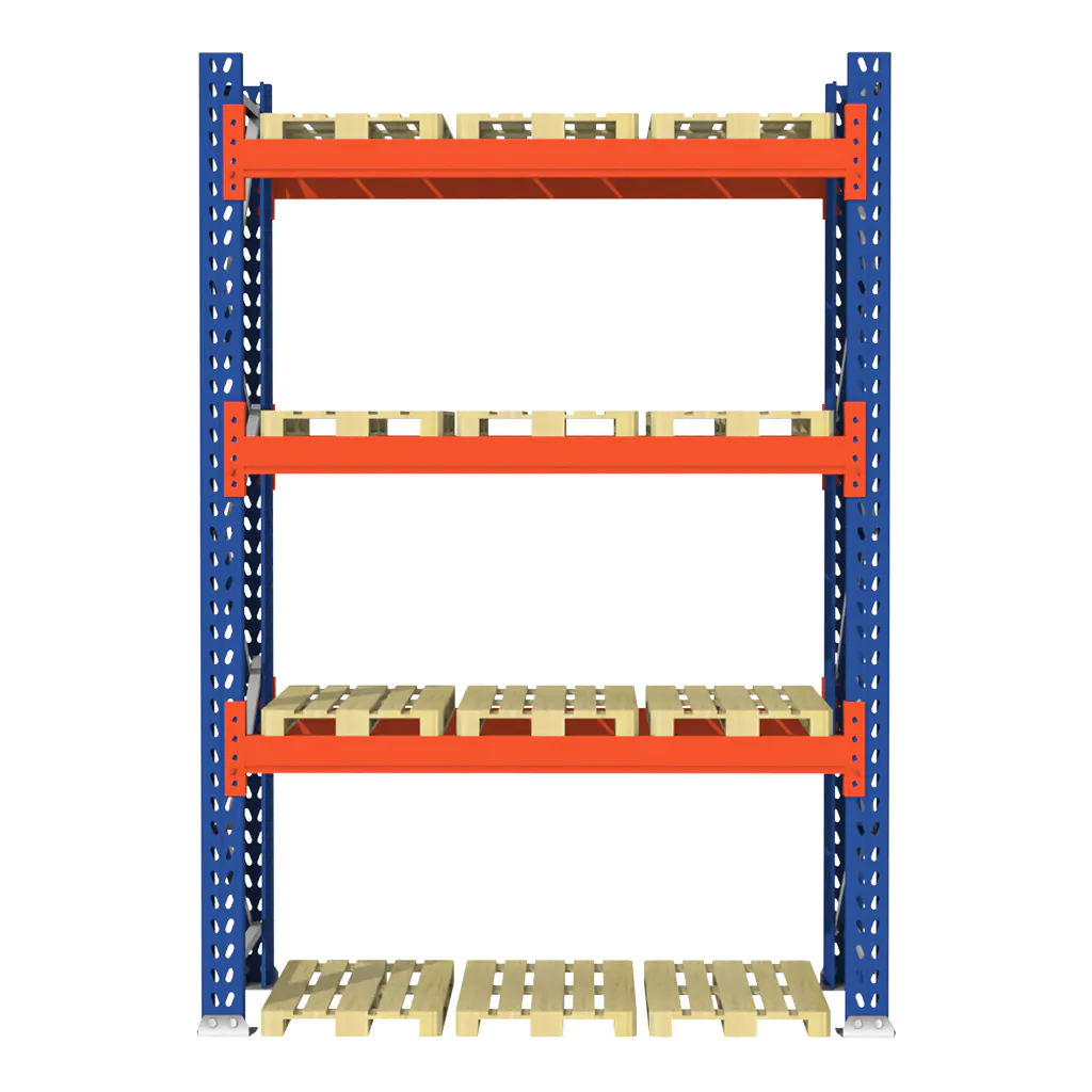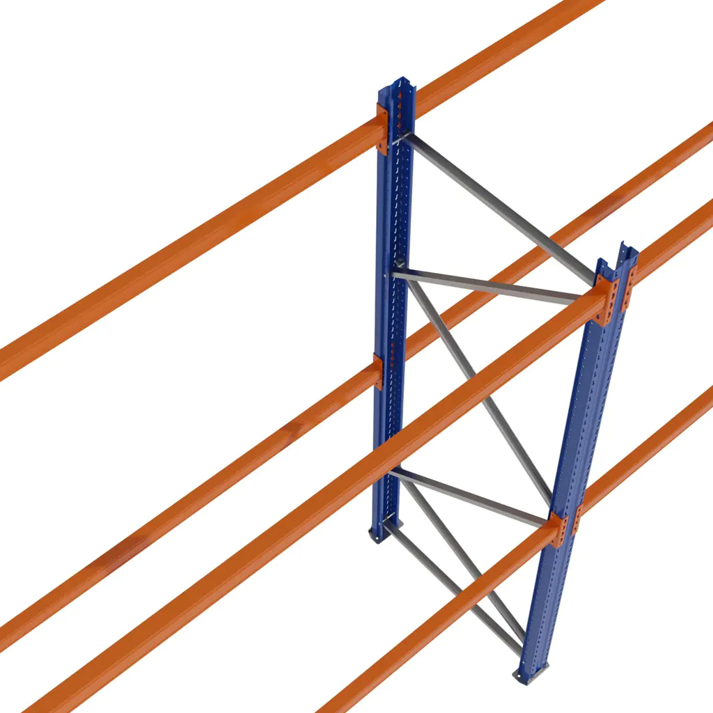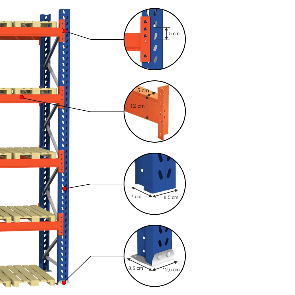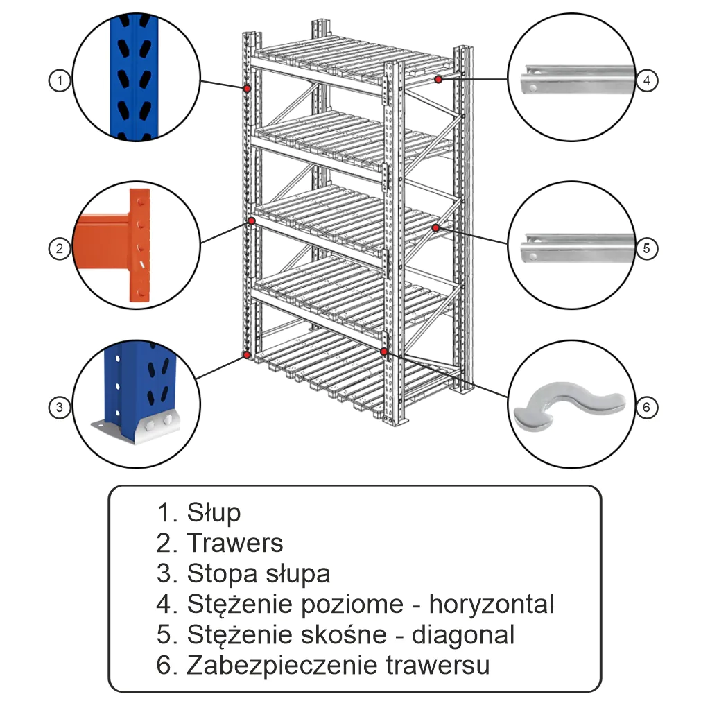 Konstrukcja modułowa: Moduł bazowy składa się z dwóch ram, które są podstawowym elementem konstrukcyjnym regału. Rama jest łączona z belkami (trawersami), które zapewniają stabilność i sztywność konstrukcji. Istnieje możliwość zbudowania ciągu regałów dowolnej długości poprzez połączenie modułu bazowego z dostępnym modułem dostawnym.