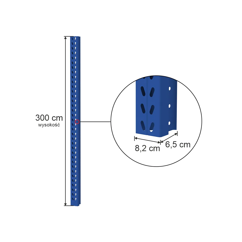 Słup MAGO HX o wysokości 300 cm jest niezbędnym elementem konstrukcyjnym do budowy solidnego i funkcjonalnego regału magazynowego. Jego wysoka jakość wykonania oraz malowanie proszkowe zapewniają trwałość i estetyczny wygląd przez wiele lat użytkowania.