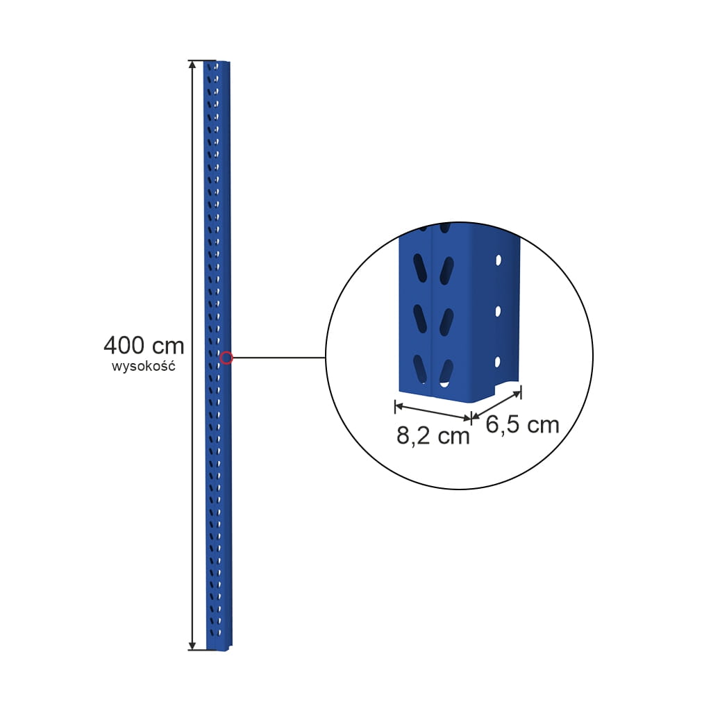 Słup MAGO HX o wysokości 400 cm jest niezbędnym elementem konstrukcyjnym do budowy solidnego i funkcjonalnego regału magazynowego. Jego wysoka jakość wykonania oraz malowanie proszkowe zapewniają trwałość i estetyczny wygląd przez wiele lat użytkowania.