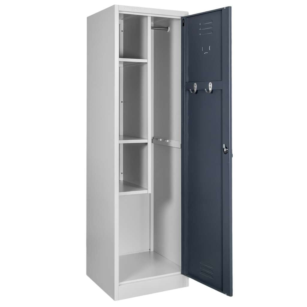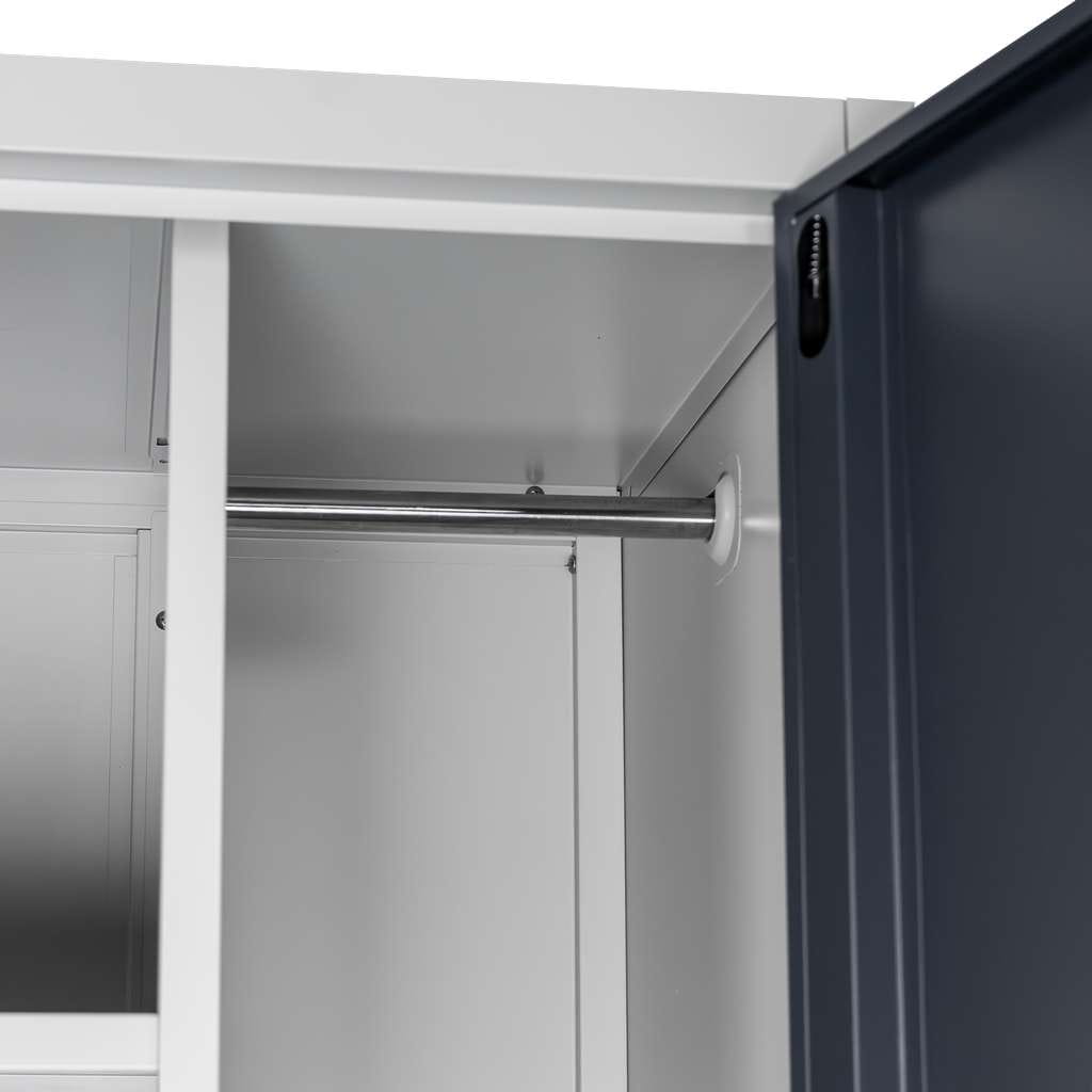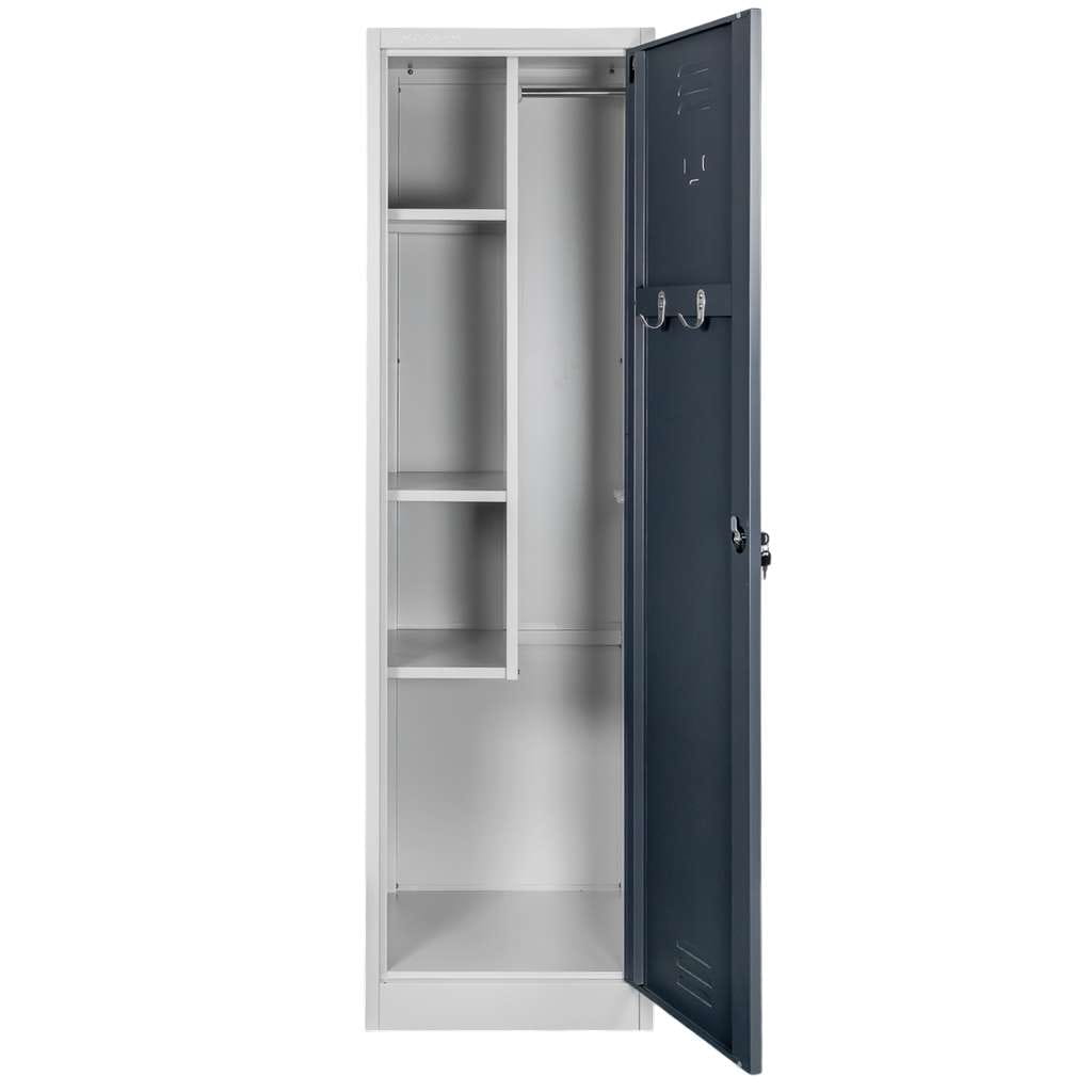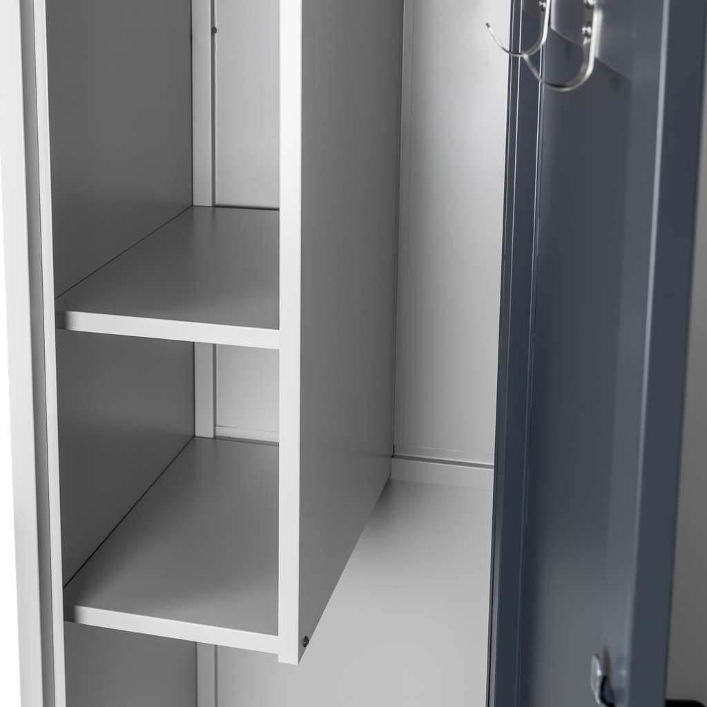 Metalowa szafa porządkowa to kompaktowe i funkcjonalne rozwiązanie do przechowywania odzieży roboczej, obuwia oraz środków czystości w pomieszczeniach socjalnych i gospodarczych. Konstrukcja wykonana z blachy stalowej o grubości 0,6 mm, malowanej proszkowo, zapewnia wysoką odporność na korozję oraz trwałość w intensywnym, codziennym użytkowaniu.