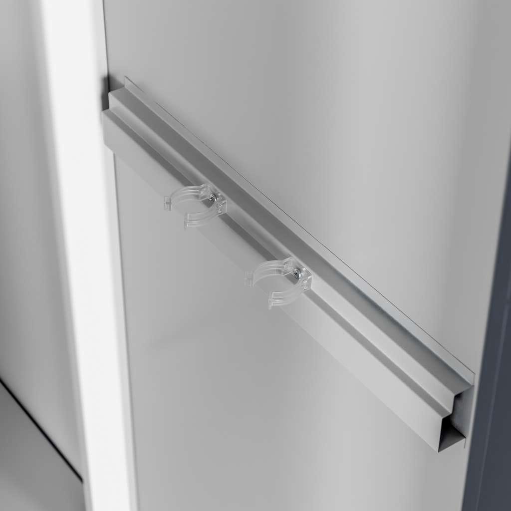 Wnętrze szafy zostało zaprojektowane z myślą o maksymalnej ergonomii. Trzy górne półki umożliwiają uporządkowane przechowywanie detergentów, środków czystości, ręczników papierowych i zapasowych akcesoriów. Dolna półka na całą szerokość sprawdzi się idealnie do przechowywania obuwia roboczego, wiader lub pojemników z chemią gospodarczą.