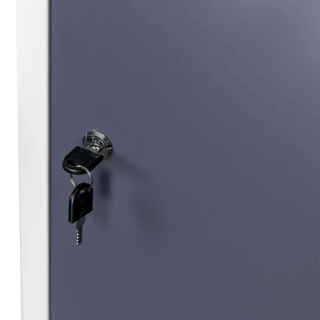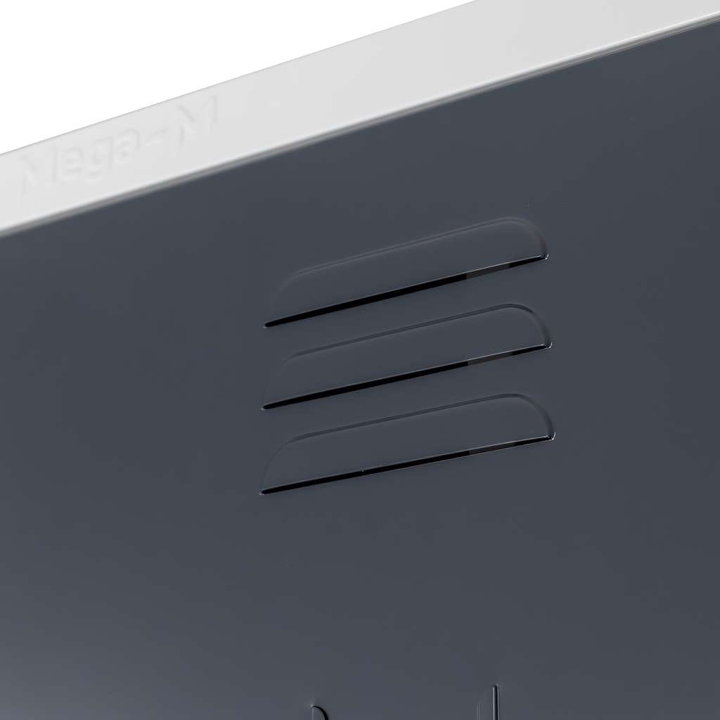 Skrzelowe otwory wentylacyjne zapewniają prawidłową cyrkulację powietrza, ograniczając wilgoć i nieprzyjemne zapachy. Jednoskrzydłowe drzwi zamykane na zamek cylindryczny skutecznie zabezpieczają zawartość przed dostępem osób nieupoważnionych. Połączenie szarego korpusu z grafitowym frontem nadaje szafie nowoczesny i estetyczny wygląd.