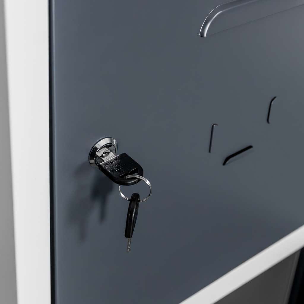 Konstrukcja wykonana z trwałej blachy stalowej malowanej proszkowo zapewnia wysoką odporność na korozję oraz uszkodzenia mechaniczne. Dwukolorowe wykończenie – szary korpus z grafitowymi frontami – nadaje szafce nowoczesny, profesjonalny wygląd, który dobrze komponuje się zarówno z wnętrzami technicznymi, jak i reprezentacyjnymi.