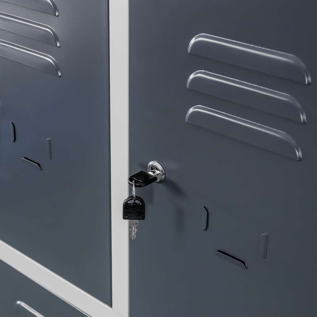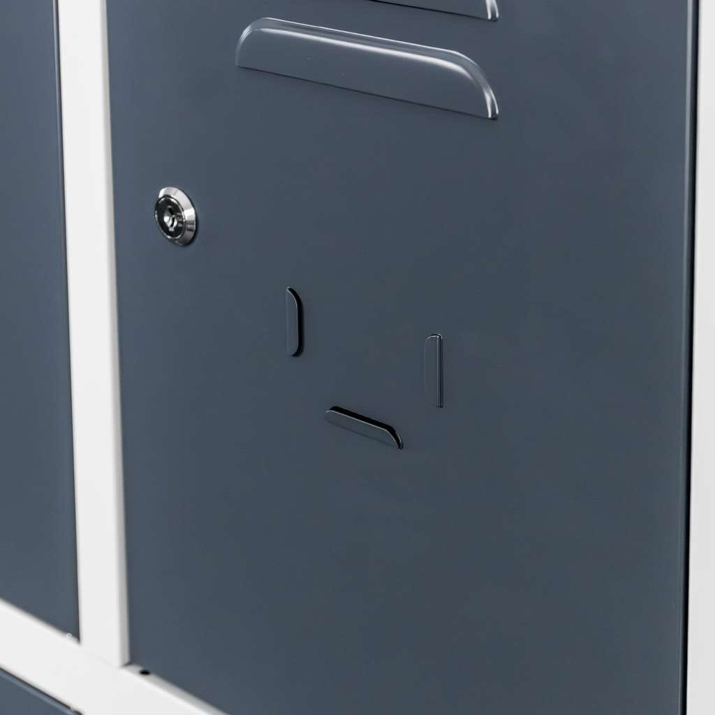 Konstrukcja została wykonana z wytrzymałej blachy stalowej malowanej proszkowo, co zapewnia wysoką odporność na korozję, uszkodzenia mechaniczne oraz intensywną eksploatację. Dwukolorowe wykończenie – szary korpus w połączeniu z grafitowymi drzwiami – nadaje szafce nowoczesny i profesjonalny wygląd, pasujący do różnorodnych przestrzeni socjalnych.