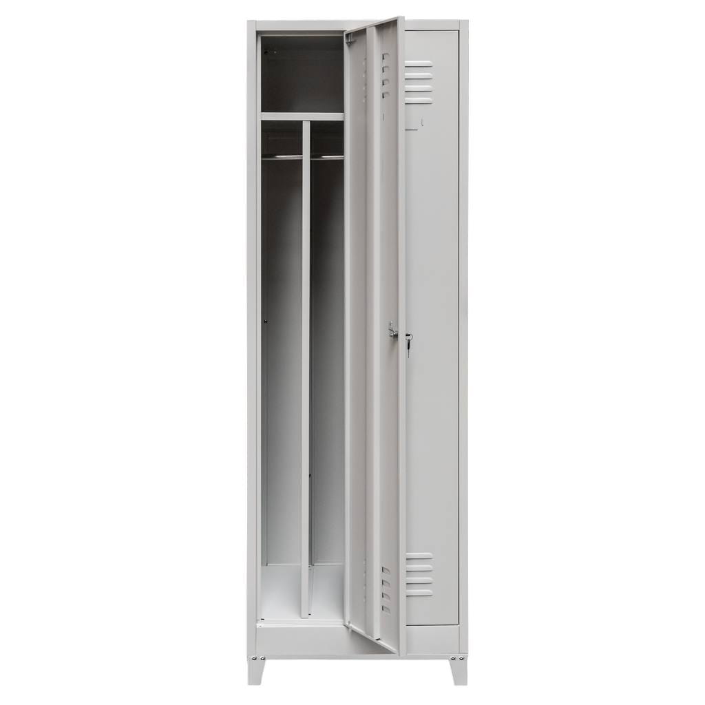 Szafka wyposażona jest w dwie oddzielne komory z przegrodami, umożliwiające rozdzielenie odzieży roboczej i prywatnej. Każda komora posiada górną półkę, drążek na wieszaki oraz haczyk, co zwiększa komfort i ergonomię użytkowania.