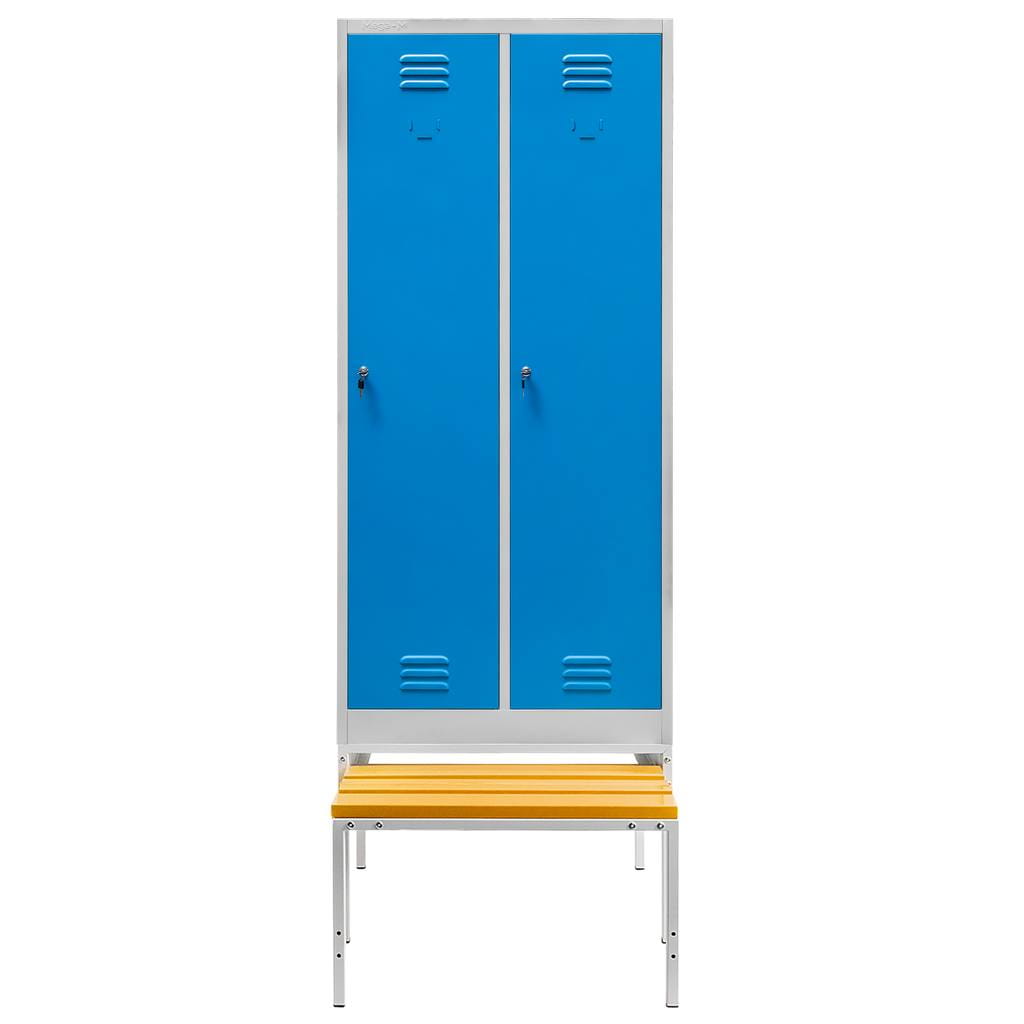 Szafka ubraniowa BHP J-80 2-drzwiowa z przegrodami na podstawie z wysuwaną ławeczką 80×80×223 cm – szary korpus, niebieski front