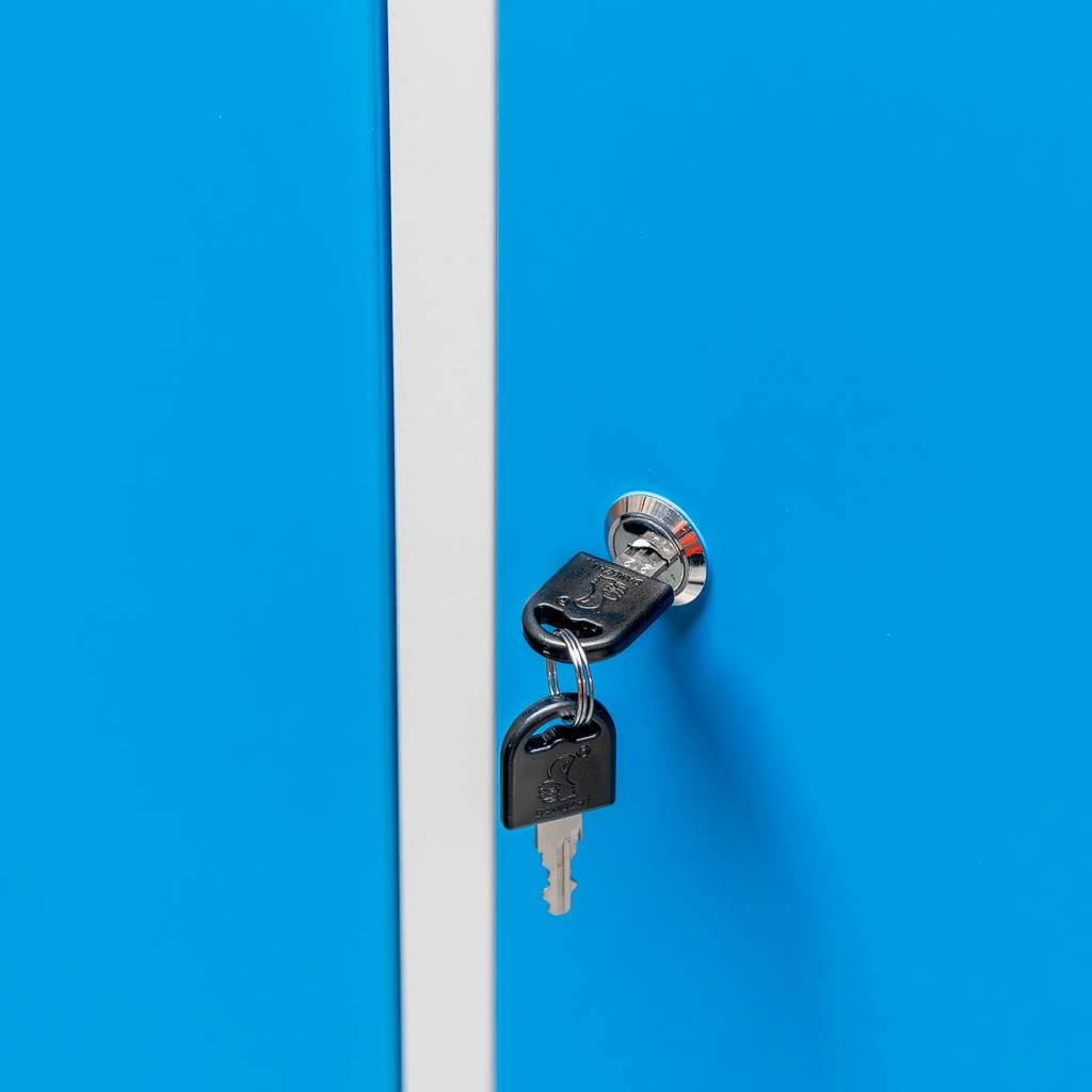 Metalowa szafka ubraniowa BHP J-80 z przegrodami na podstawie z nóżkami to trwałe i estetyczne wyposażenie szatni pracowniczych oraz przestrzeni socjalnych. Wykonana z wysokiej jakości blachy stalowej i zabezpieczona powłoką proszkową, zapewnia odporność na korozję oraz intensywne użytkowanie. Szary korpus połączony z niebieskimi frontami nadaje szafce nowoczesny i czytelny wygląd.