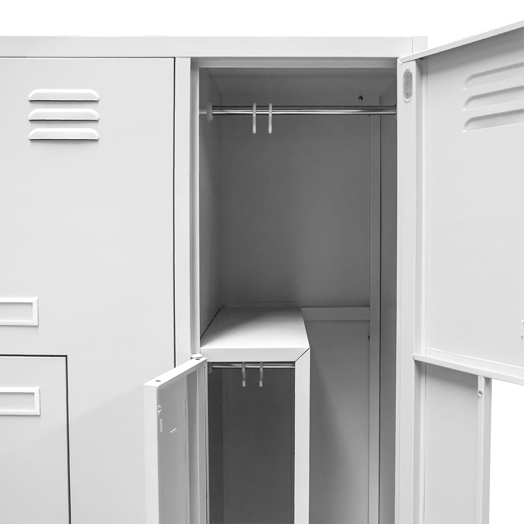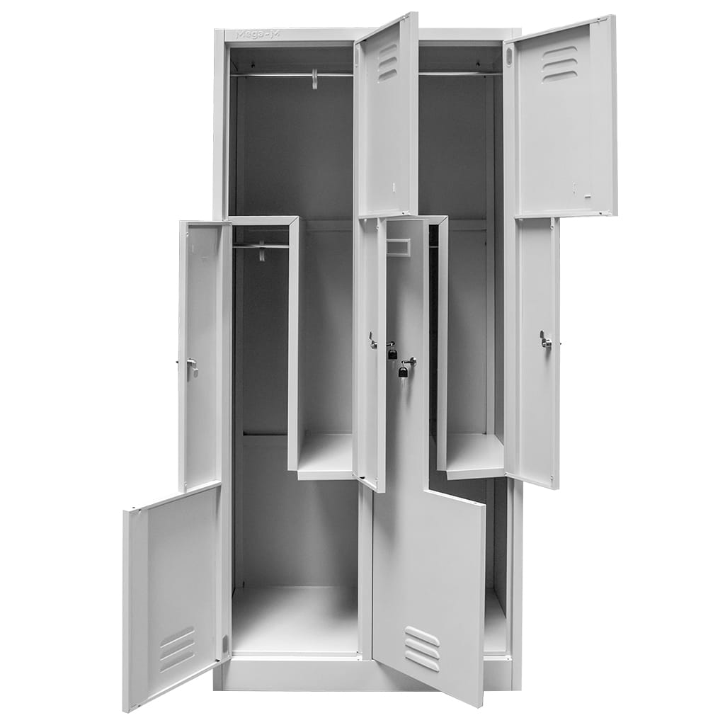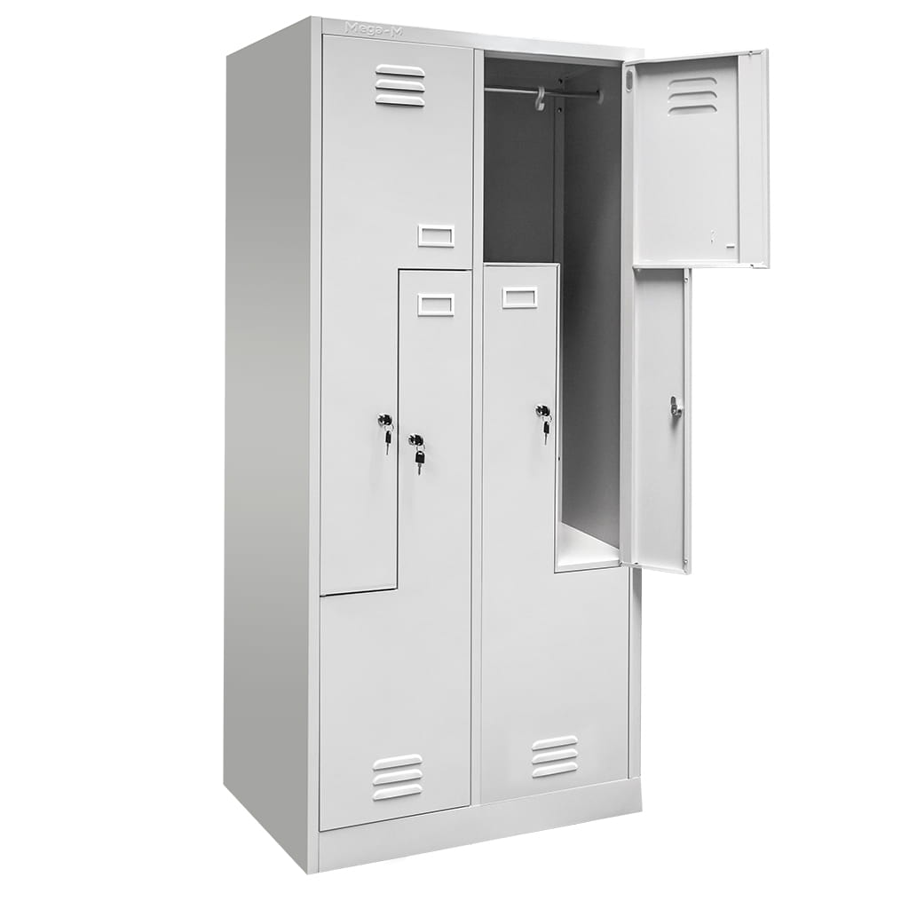 Szafka ubraniowa BHP J-80/L w wersji 4-drzwiowej typu L to funkcjonalne i oszczędzające przestrzeń rozwiązanie do szatni pracowniczych oraz pomieszczeń socjalnych. Układ komór w kształcie litery L umożliwia wygodne przechowywanie rzeczy czterech użytkowników przy zachowaniu kompaktowej szerokości 80 cm.
