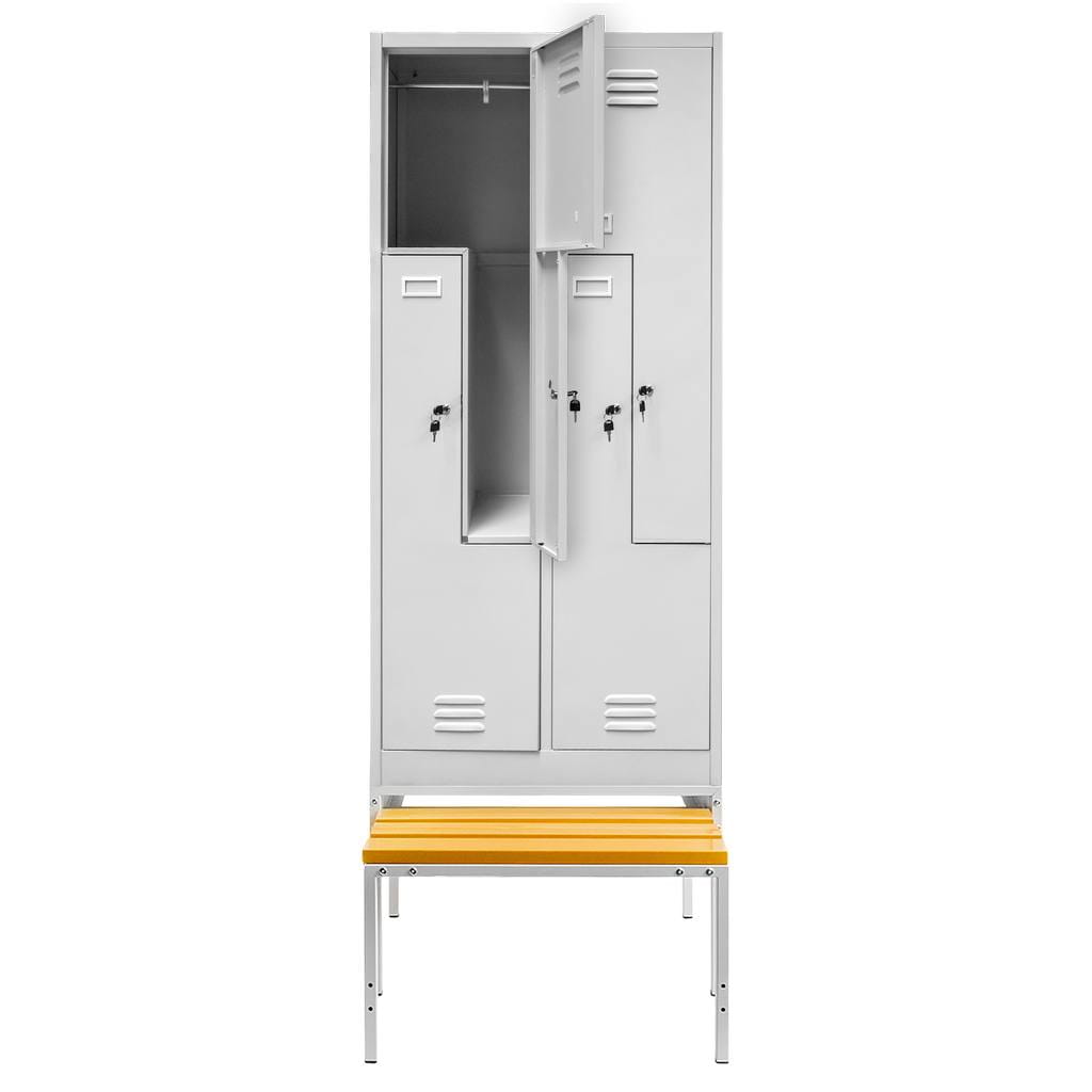 Szafka ubraniowa BHP J-80/L 4-drzwiowa typ L na podstawie z wysuwaną ławeczką 80×80×223 cm