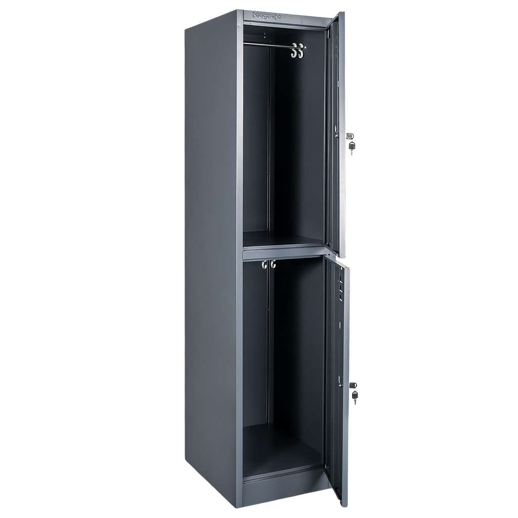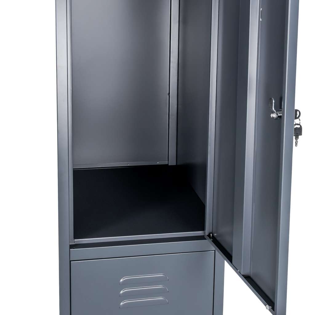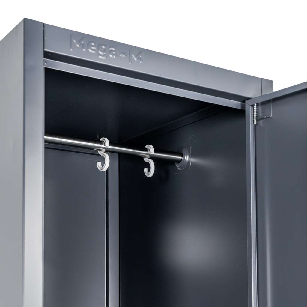 Szafka wyposażona jest w dwie niezależne skrytki, każda zamykana osobnym zamkiem cylindrycznym. Wizytowniki na drzwiach ułatwiają identyfikację użytkowników, a skrzelowe otwory wentylacyjne zapewniają stały przepływ powietrza, chroniąc zawartość przed wilgocią i nieprzyjemnymi zapachami.