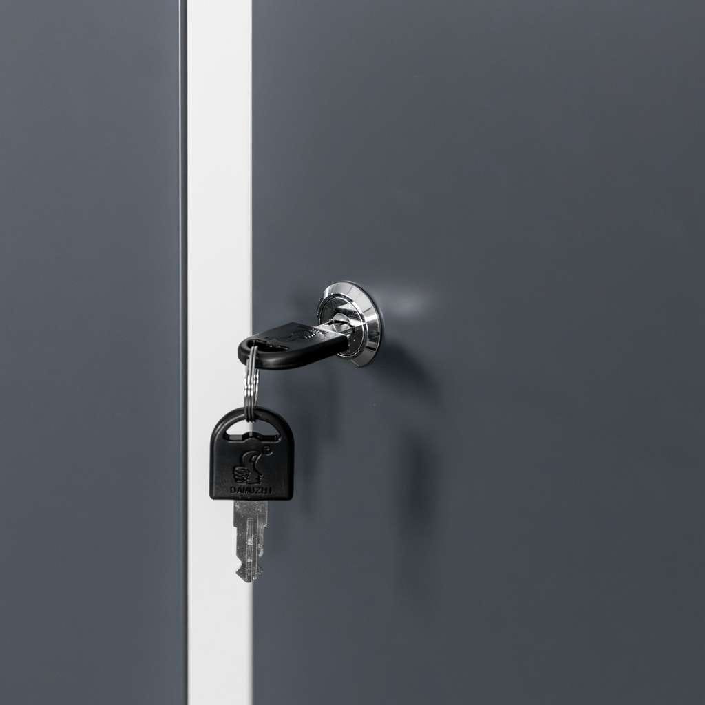 Korpus szafki wykonano z trwałej blachy stalowej zabezpieczonej powłoką proszkową w kolorze szarym, natomiast grafitowe fronty nadają całości nowoczesny i profesjonalny wygląd. Konstrukcja cechuje się wysoką odpornością na uszkodzenia mechaniczne oraz intensywne, codzienne użytkowanie.