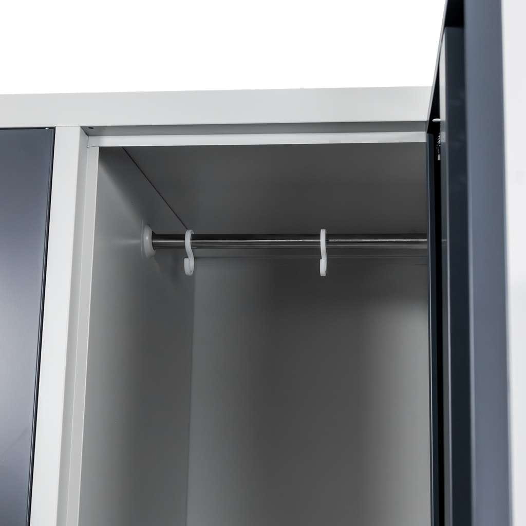 Każda skrytka zamykana jest na osobny zamek cylindryczny i wyposażona w drążek z haczykami, co pozwala na wygodne zawieszanie odzieży roboczej lub prywatnej. Skrzelowe otwory wentylacyjne umieszczone w górnej i dolnej części drzwi zapewniają odpowiednią cyrkulację powietrza, ograniczając wilgoć i nieprzyjemne zapachy. Dodatkowo wytłoczone miejsca na etykiety umożliwiają łatwą identyfikację użytkowników.