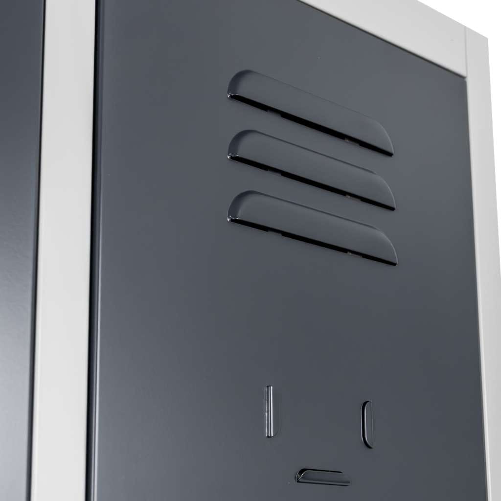 Każda skrytka wyposażona jest w drążek z haczykami umożliwiający wygodne zawieszanie odzieży roboczej lub prywatnej. Skrzelowe otwory wentylacyjne umieszczone w górnej i dolnej części drzwi zapewniają skuteczną cyrkulację powietrza, ograniczając wilgoć i nieprzyjemne zapachy. Dodatkowo wytłoczone miejsca na etykiety lub numerację ułatwiają organizację użytkowników.